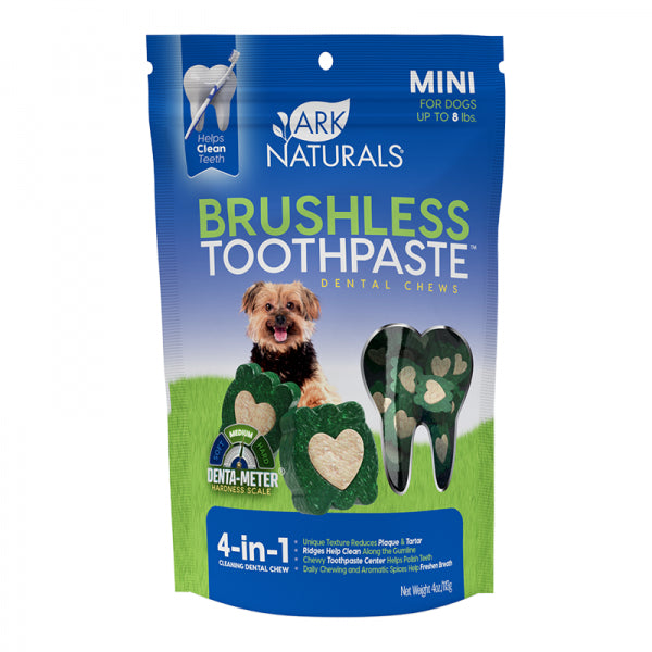 Our 4-in-1 Brushless Toothpaste dental chews clean, polish, and freshen breath! Their unique texture helps reduce plaque, tartar, and helps clean along the gumline as your dog chews. Plus – they are the only 4-in-1 dental chew that has a chewy toothpaste center that polishes teeth. Ranked Medium on our DENTA-METER™, they are perfect for your everyday chewers!