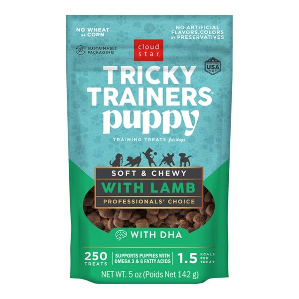THE TRICK TO TRAINING. Tricky Trainers has been a trusted choice for professional trainers since 1999. These highly aromatic, soft & chewy treats are bite-sized and are made with wholesome ingredients so you can feel good about rewarding your puppy for their good behavior during training sessions or any time! Each lamb puppy treat is only 1.5 calories and is packed with ingredients that help to support your growing puppy like DHA and omega 3 & 6 fatty acids! Time-tested and dog-approved, Tricky Trainers are Just the Trick to Train Your Dog.