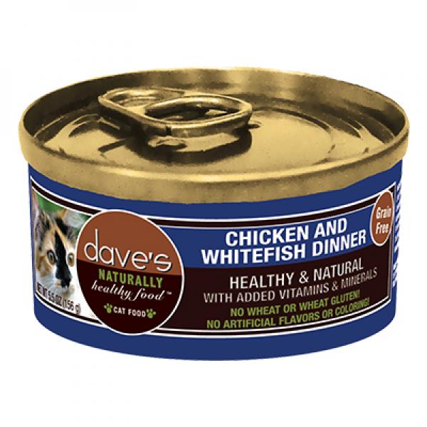 Give your kitty the nutrition he needs to thrive with the Dave's Pet Food Naturally Healthy Grain-Free Chicken & Whitefish Dinner Canned Cat Food. The formula provides plenty of protein to fuel all those adventures, with protein-rich chicken and whitefish as the top ingredients. Every juicy bite is loaded with wholesome omegas for a lustrous coat, plus vitamins, minerals and essential taurine to help your pal look and feel his best. With no grains, wheat or anything artificial, even kitties with sensitivities can dive into their bowl.