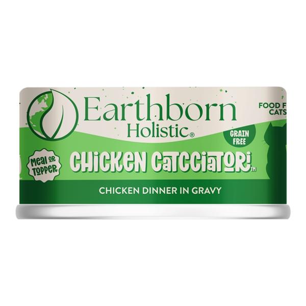 Earthborn Holistic Chicken Catcciatori grain-free natural canned cat and kitten food, made with highly-digestible chicken and chicken broth as the top ingredients.