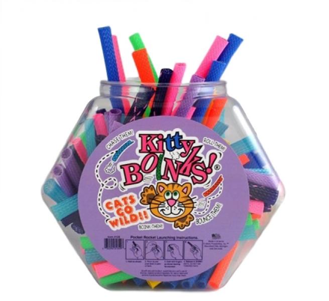 Turn a cat into a kitten again with Kitty Boinks. This clever mesh tube springs into action and makes cats go wild. When compressed Kitty Boinks shoot up to 30 feet, providing cats with tons of exercise and excitement. Cats can’t seem to get enough of this colorful mesh pocket rocket. Kitty Boinks are an off “shoot” of Boinks. Cat owners realized their cat couldn’t keep its paws off the popular toy when it was shot across the room. When Kitty Boinks ends are tucked in they will roll with the personality of your cat. Various colors.