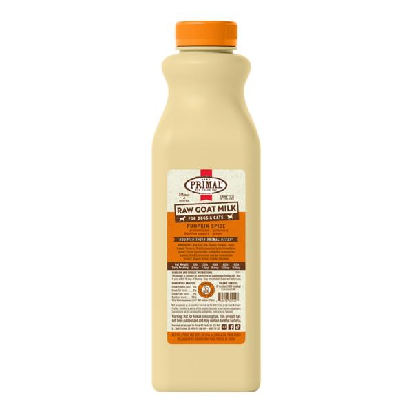 A nutrient-rich hydration option plus organic pumpkin and ginger—ingredients that are known to provide fiber and support digestion! Suitable for dogs or cats. Pumpkin Spice Raw Goat Milk is available in 32oz resealable bottles.