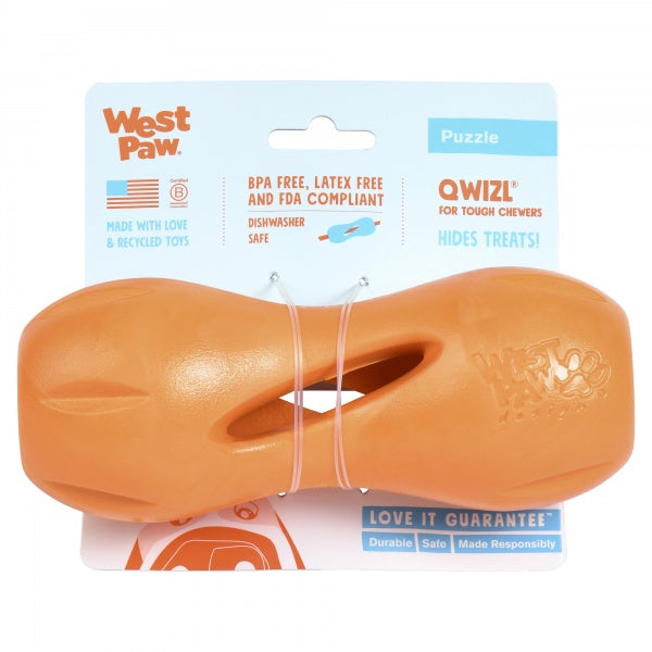 Qwizl is a super tough treat toy that's brilliantly designed to extend the life of expensive dog treats while keeping dogs busy. Side openings release scent and taste while the continuous interior hole allows treats to extend out. Flexible ridges grip multiple sizes of treats. Built for tough chewers.